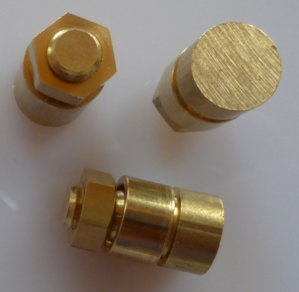 Schaft D=8 mm, L=14 mm aus Messing, blank montiert mit Ring 8×4,5 mm und Mutter M 5 aus Messing, blank Bohrungs-Durchmesser 2,3 mm